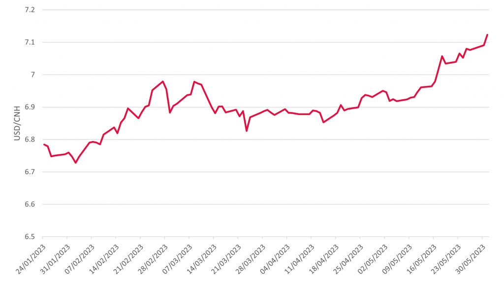 The Chinese renminbi (CNY) broke through a key level of 7.0 and depreciated by more than 2.8% against the US dollar (USD), making it one of the worst performers in May.