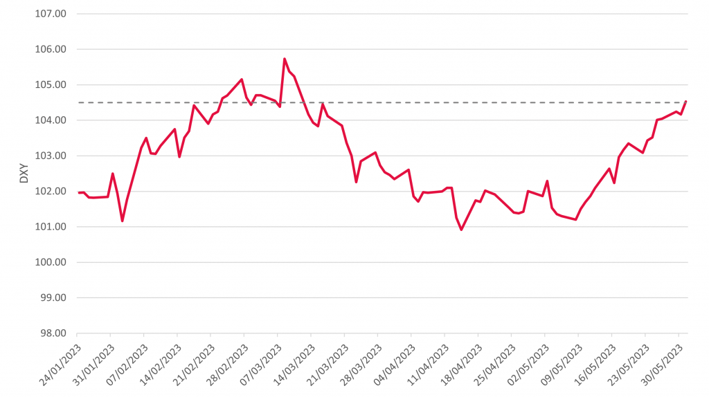 May saw the US dollar (USD) become the top-performing currency across the board. The US Dollar Index (DXY) – a measure of the value of the USD against a basket of currencies – recovered to 104.5, with the USD rising over 2.8%.