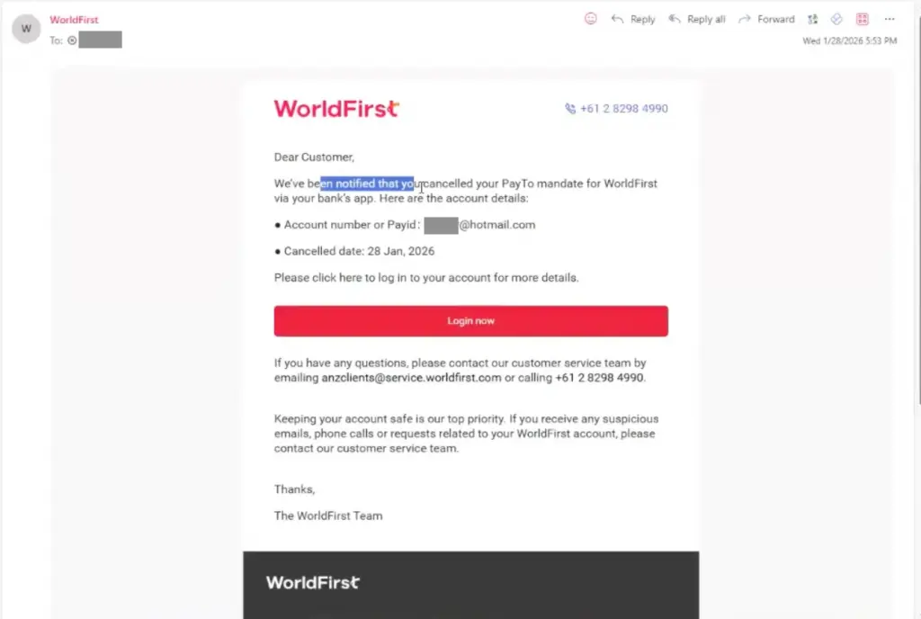 - You’ll receive an email confirming the cancellation of your PayTo agreement.
