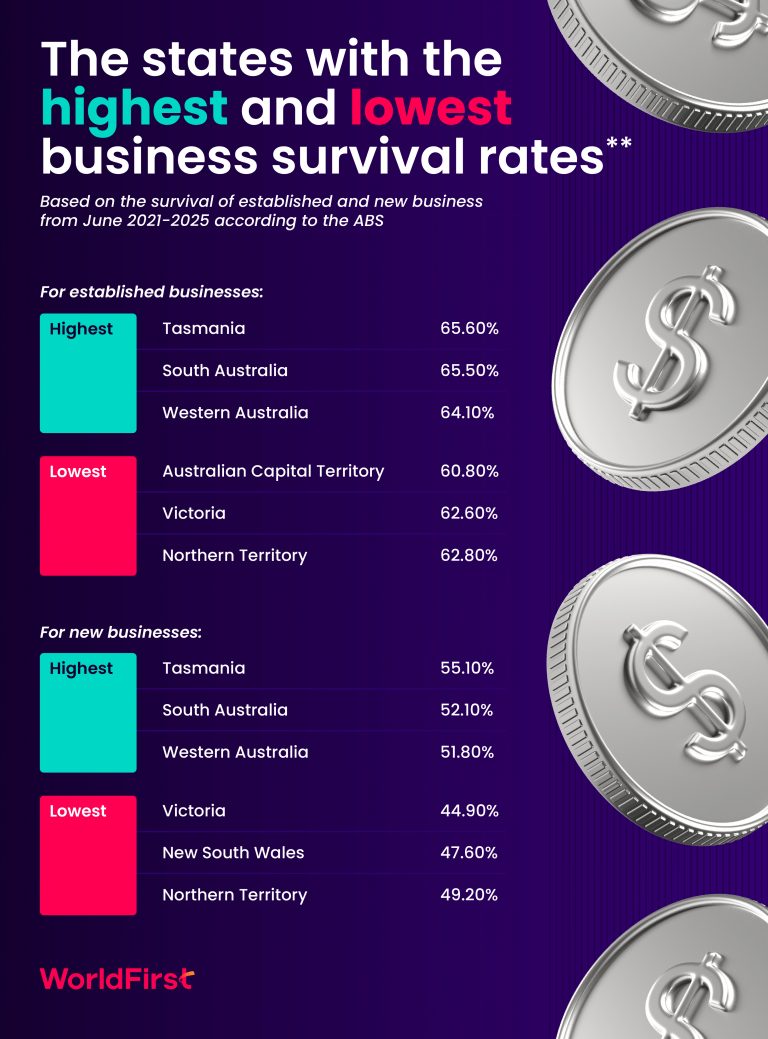 - Western Australia sees 87.6% of businesses survive their first year, 11.1% higher than the national average