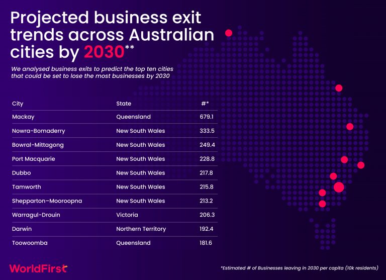 The state of New South Wales is also predicted to face significant losses, with cities like Nowra-Bomaderry set to lose around 334 businesses per 10,000 people in the next 5 years.