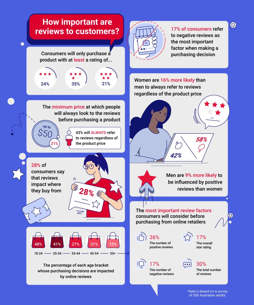 We recently conducted a study of 500 Australian adults, which found that 28% prioritise looking at reviews before buying a product. In addition, 35% place the most emphasis on the number of positive reviews before committing to a purchase.