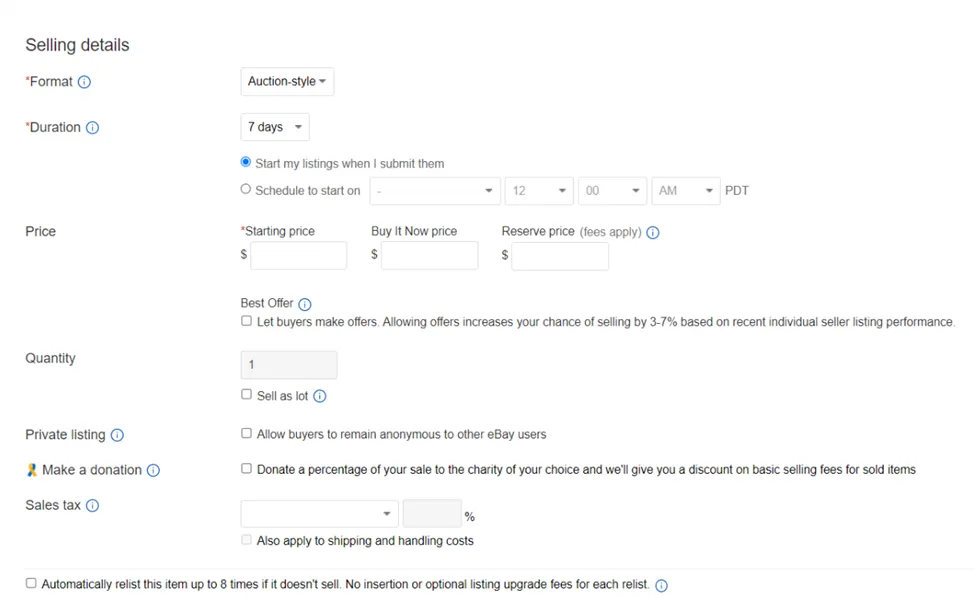 You can set a specific price or allow customers to send offers and bid for products. If you are taking bids, you must add a scheduled start time.