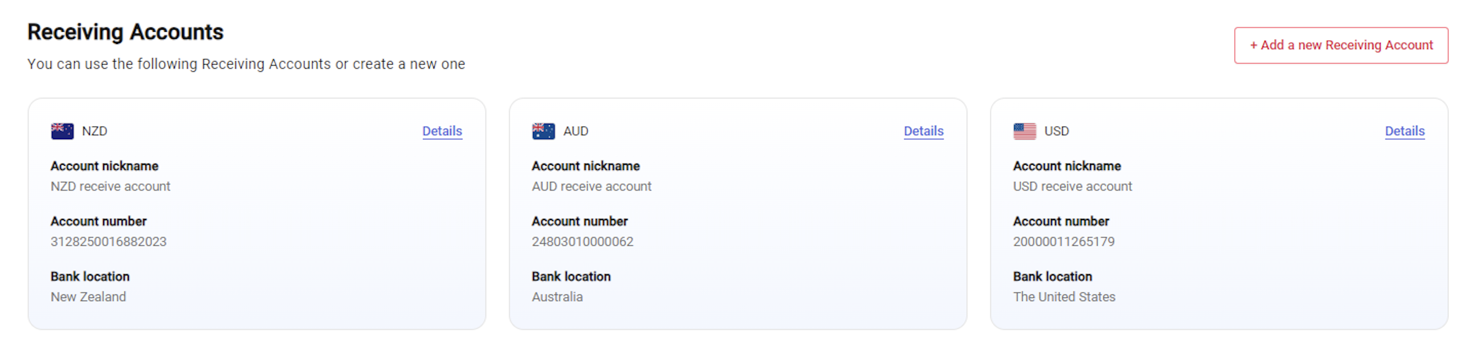 6. Copy and paste the account details from your WorldFirst Receiving Account. The banking information required will depend on the location.