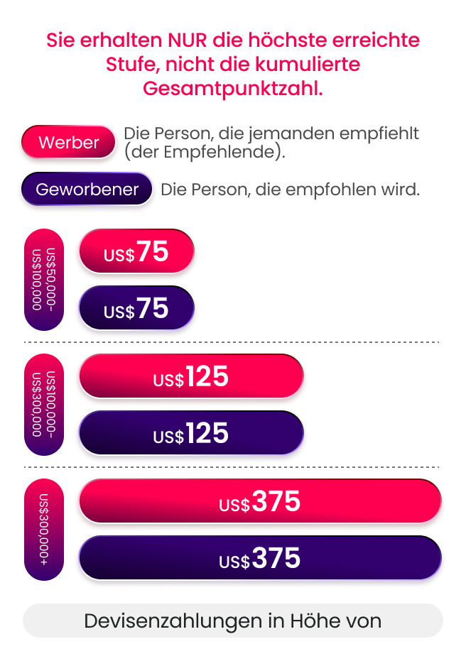 Beispiel: Wenn zwei Ihrer Empfehlungen jeweils ein Devisenvolumen von über 300.000 USD erzielen und außerdem die erste Aufgabe für 100 USD abgeschlossen haben, erhalten Sie: (100 USD + 375 USD) * 2 = insgesamt 950 USD Prämien.