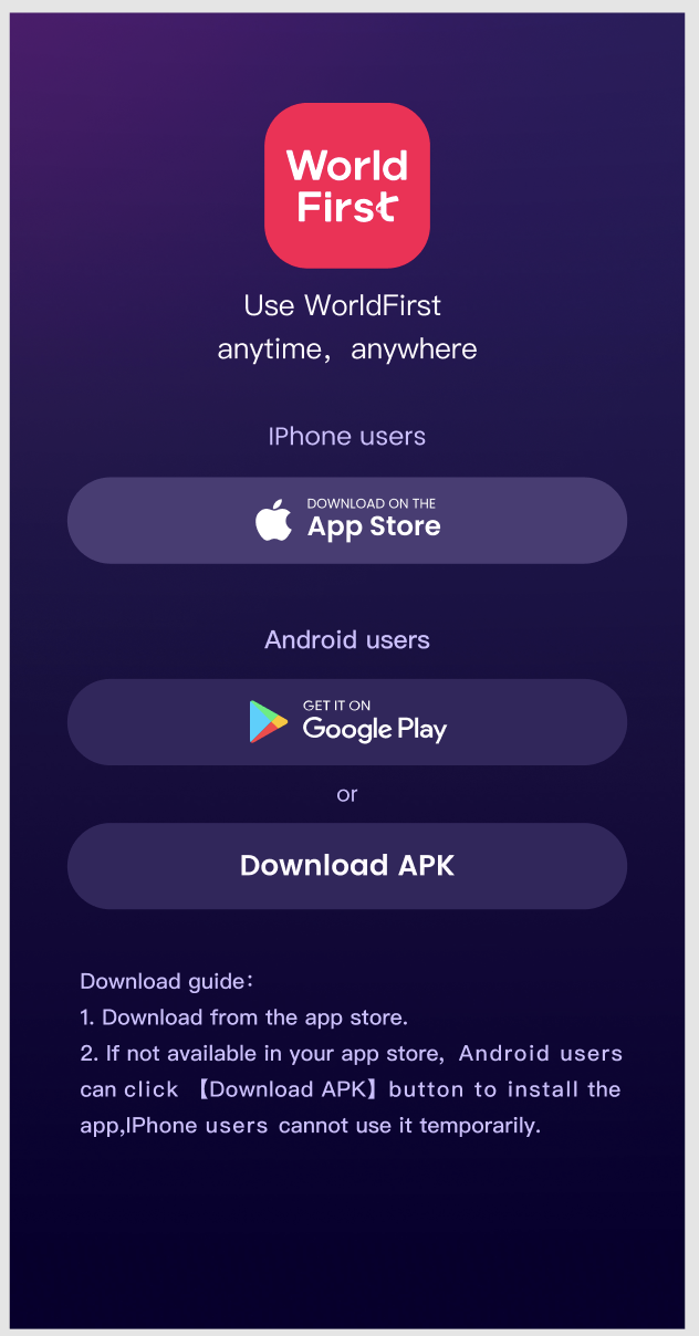 Any business who source goods from Chinese suppliers can benefit from WorldTrade. You can buy from nearly 1 million Chinese businesses who're also WorldFirst users. However, we currently don't support buyers from Iran, North Korea, Syria, Cuba, Crimea, Luhansk, Donetsk, Russia, Belarus, Myanmar, Zimbabwe, Israel, Palestine, and China Mainland. Buyers with activated Zyla Accounts in the United States are also temporarily not supported.