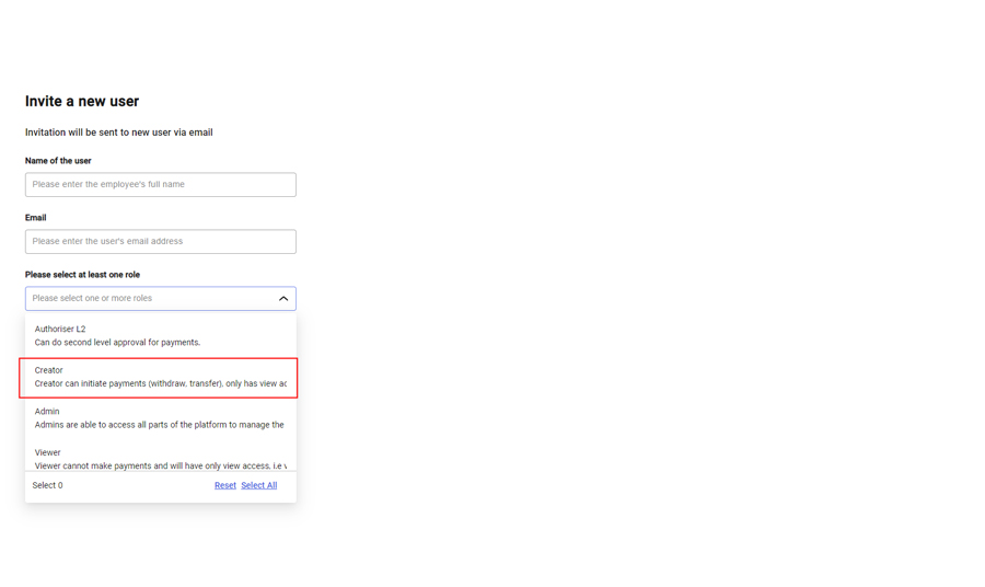 Select one or more roles for the user (or ‘select all’ in the bottom right of the drop down).