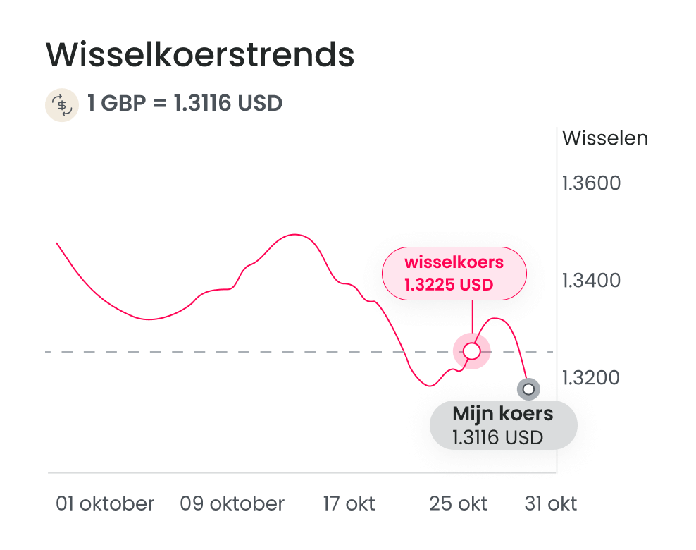 Stel je gewenste wisselkoers in en wij voeren de transactie uit zodra de markt die koers bereikt - 24/7. Je kunt van tevoren instellen om direct te wisselen of dat de afwikkeling later, binnen twee werkdagen, plaatsvindt.