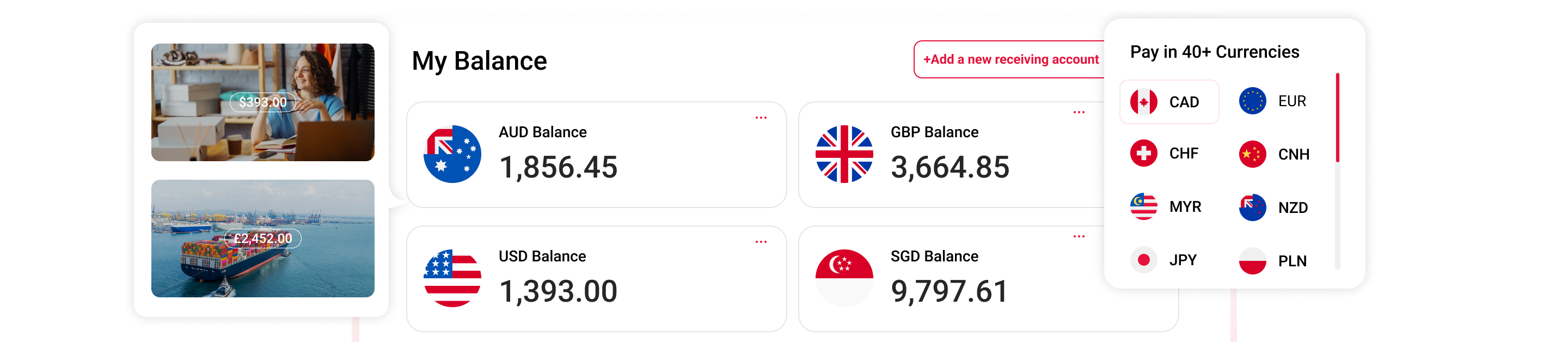 You can send payments in 40+ currencies across 130 countries and regions and receive payments in 24 currencies. We currently support the world’s major currencies: GBP, USD, EUR, AUD, JPY, NZD, SGD, HKD, CNH, CAD, PLN, CZK, THB, DKK, MXN, AED, SAR, CHF, SEK, NOK, ZAR, RON, ILS, and BGN.