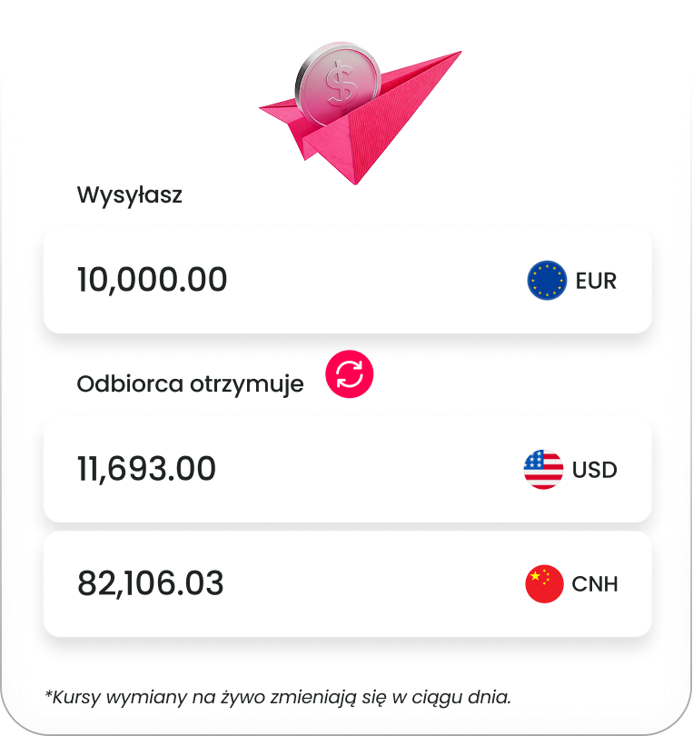 Nasze bezpośrednie połączenia z Chinami kontynentalnymi i Hongkongiem ułatwiają dokonywanie płatności w USD i CNH tego samego dnia. Bez pośredników. Bez opóźnień. Szybkie wysyłanie, łatwe śledzenie i zawsze po przejrzystych kursach wymiany walut, które są bardziej korzystne niż marże polskich banków.
