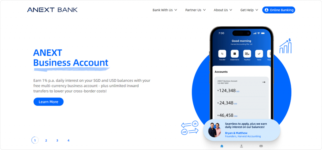 ANEXT offers a multi-currency business account supporting SGD, USD, EUR and CNH. Balances in SGD, USD and EUR earn 1.0% p.a. interest, credited daily. There are no setup or monthly fees and onboarding for Singapore-registered companies is fully digital via Singpass and Corppass.