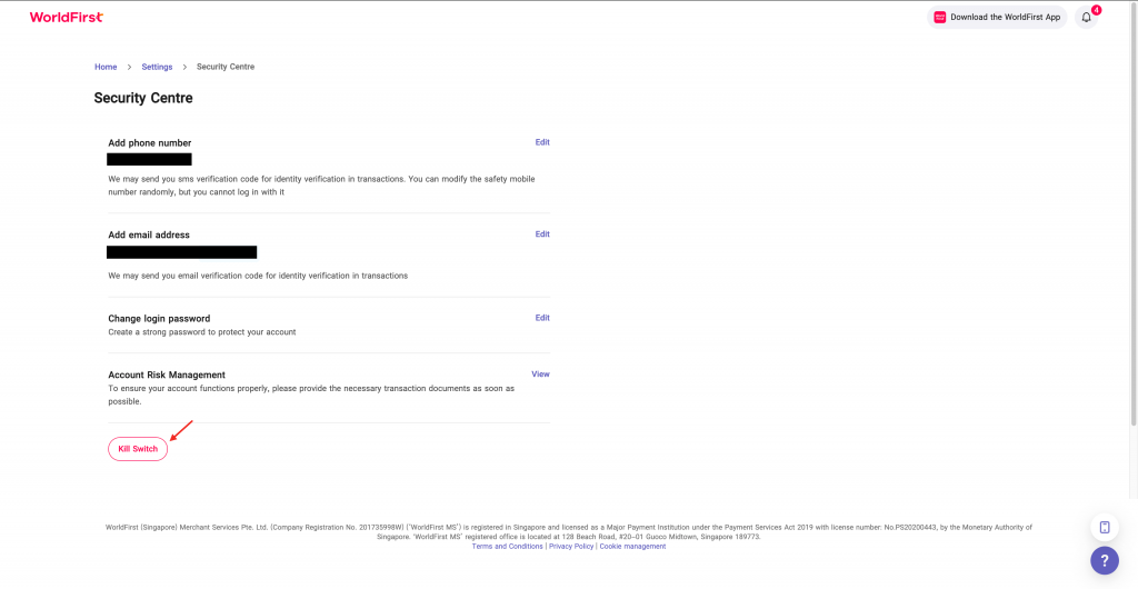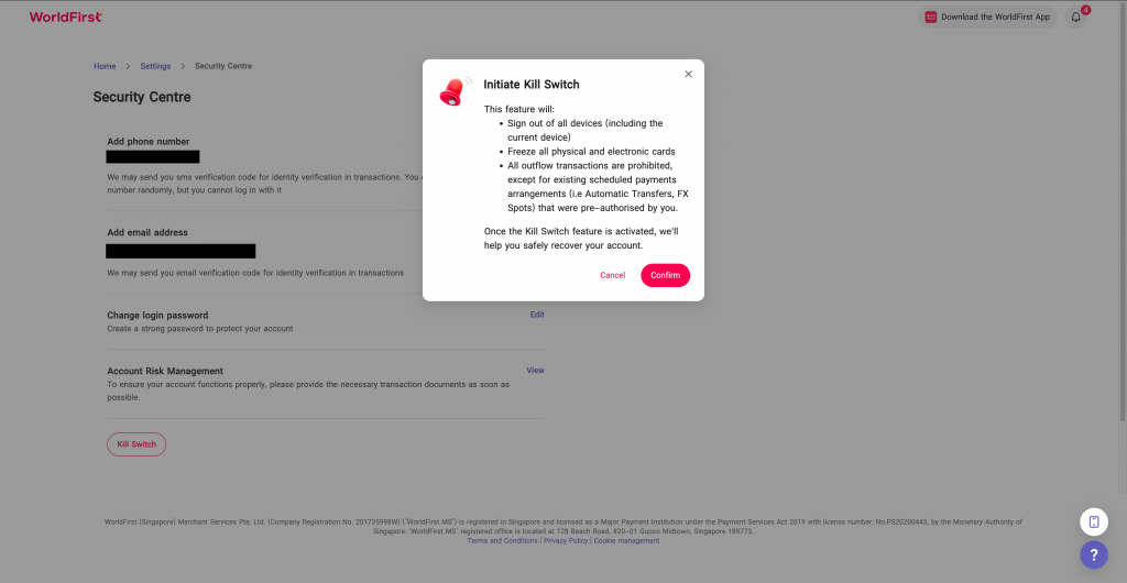 Please note that the activation of Kill Switch for your account does not, by default, block incoming funds transfers or existing scheduled payments arrangements (i.e Automatic Transfers, FX Spots) that were pre-authorised by you. If you wish to extend the deactivation to these functionalities, you can request by contacting our team via email [email protected] or hotline +65 6805 4380 (Monday – Thursday 9am – 6pm SGT, Friday: 9am – 5pm SGT).