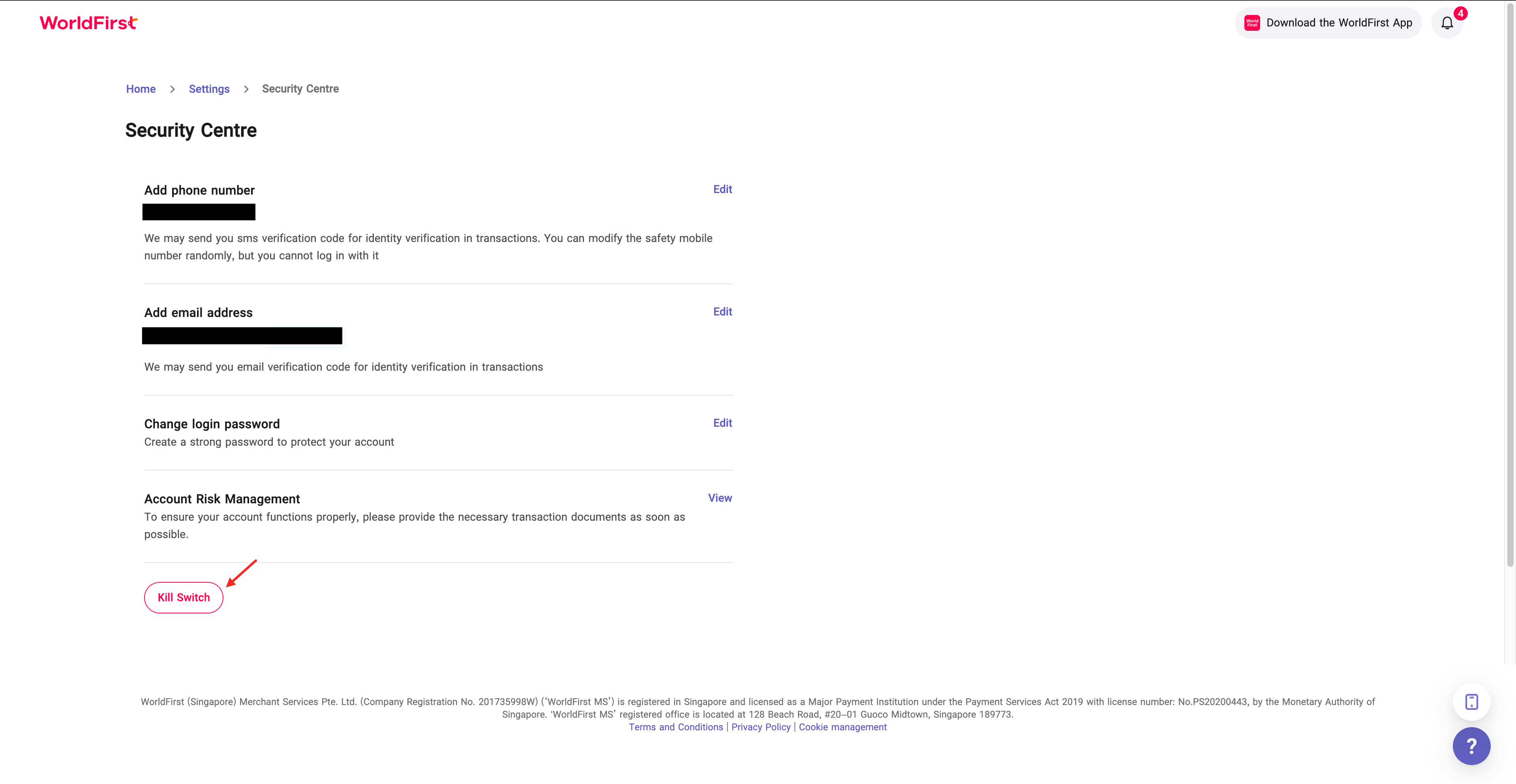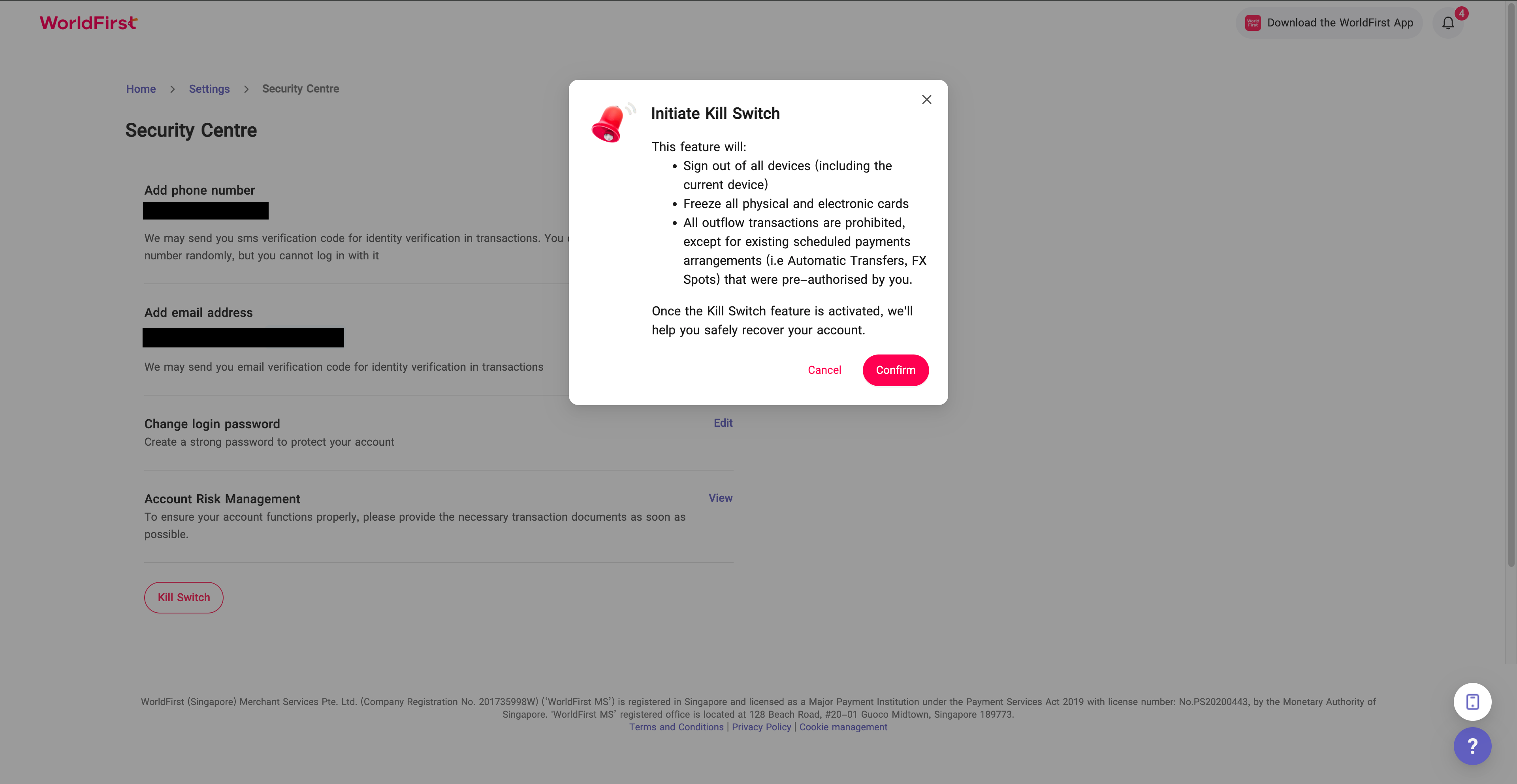 Please note that the activation of Kill Switch for your account does not, by default, block incoming funds transfers or existing scheduled payments arrangements (i.e Automatic Transfers, FX Spots) that were pre-authorised by you. If you wish to extend the deactivation to these functionalities, you can request by contacting our team via email [email protected] or hotline +65 6805 4380 (Monday – Thursday 9am – 6pm SGT, Friday: 9am – 5pm SGT).