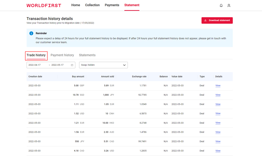 You can download your trade statement for the selected date range by selecting ‘Download statement’ on the right-hand side.