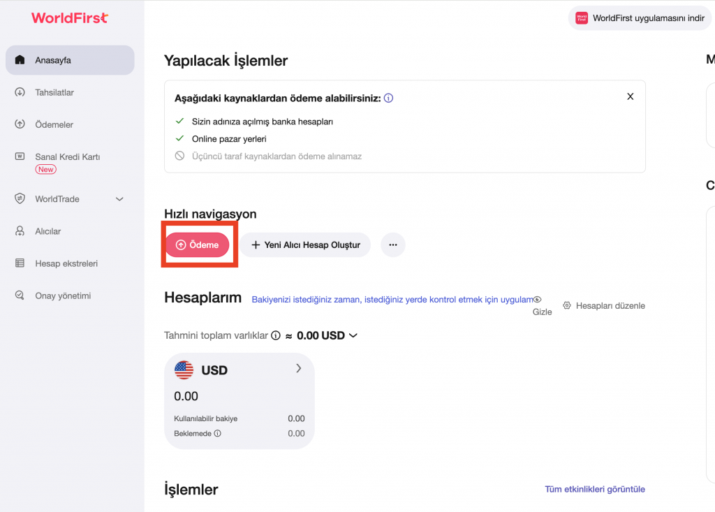 - Başka bir World Hesabına para göndermek için “Ödemeler” bölümüne gidin