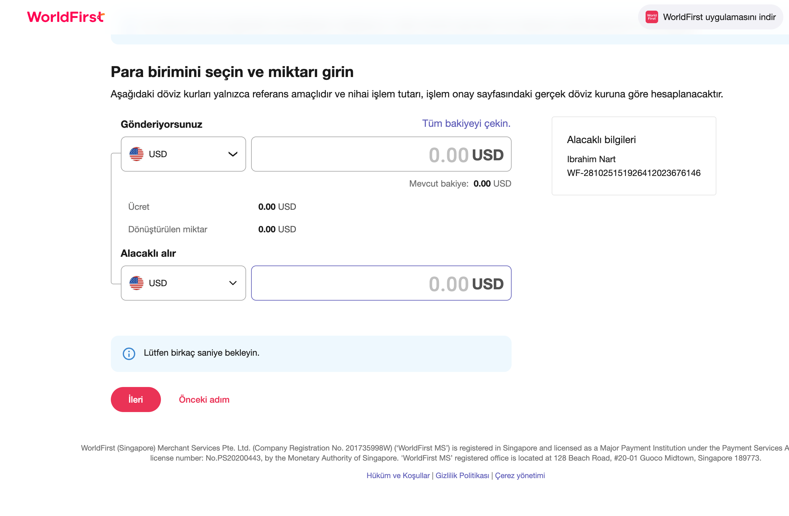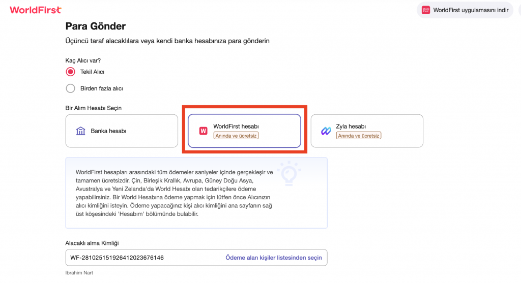 Ödeme alacak kişi bir WorldFirst kullanıcısıysa, World hesabına anında ve ücretsiz olarak doğrudan transfer gerçekleştirebilirsiniz. Bunun için ödeme alacak kişiden World Alıcı Kimliği talep etmeniz yeterlidir.