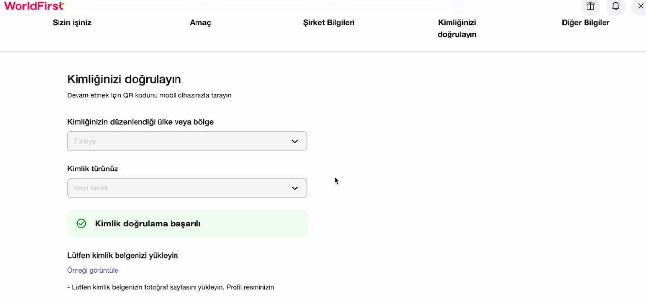 - Mobil doğrulama çalışmazsa, masaüstü tarayıcınız üzerinden kimliğinizin bir görüntüsünü ve kimliğinizi tutarken çekilmiş bir fotoğrafınızı yükleyerek devam edebilirsiniz (Lütfen fotoğrafı talimatlara uygun şekilde çektiğinizden emin olun).