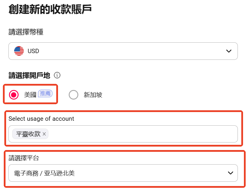 - 點選「創建收款帳戶」,選擇您需要收取的貨幣(此處以收款美國亞馬遜為例)。開戶地選擇【美國】,收款帳戶用途選擇【平台收款】,平台選擇【電子商務/亞馬遜北美】。