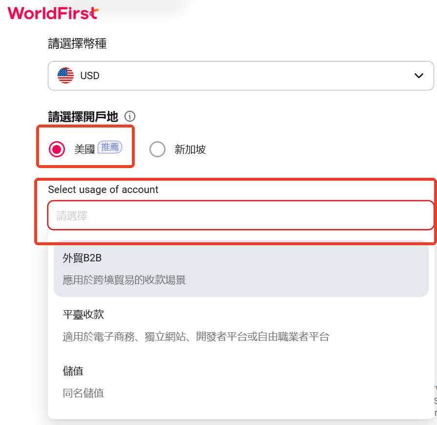 - 請根據您的業務需求選擇收款貨幣。此指引以儲值美金(USD)為例進行說明