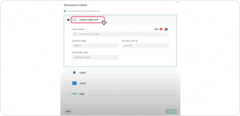 On the Payment page, locate and click Add Payment Method button