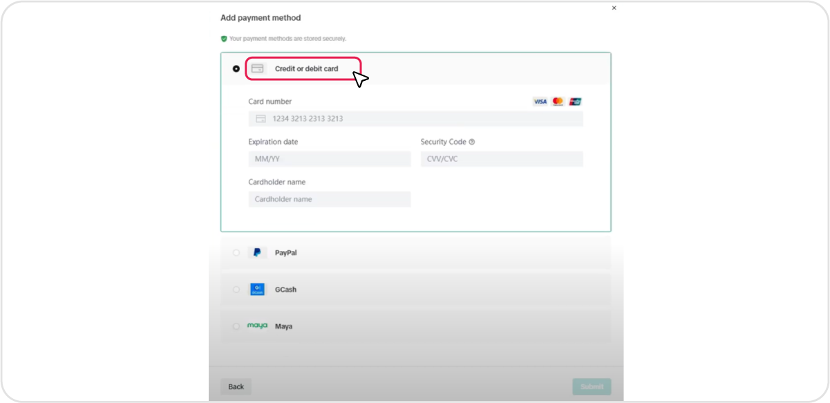 On the Payment page, locate and click Add Payment Method button
