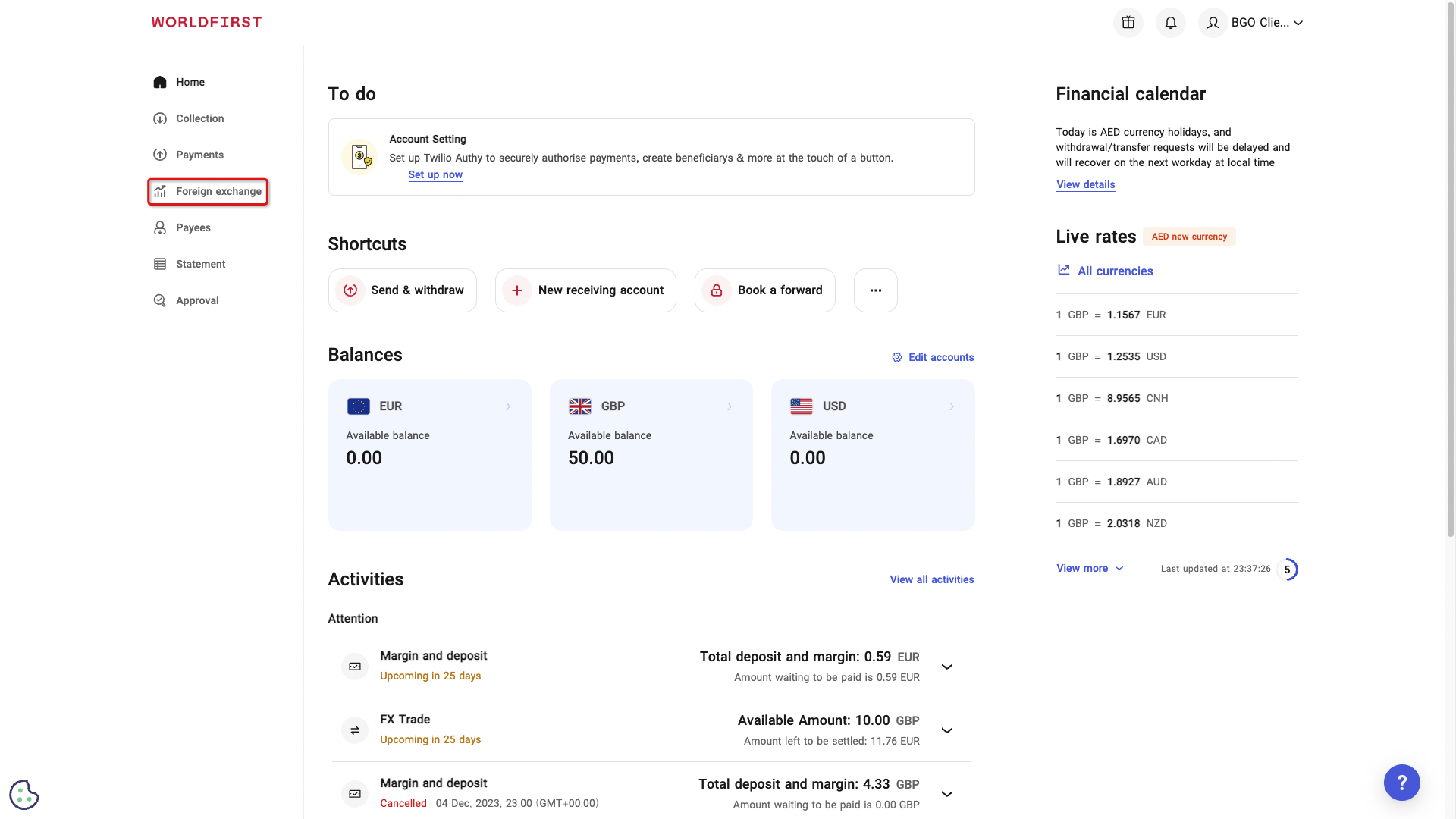 Navigate to ‘Foreign exchange’ on the left side navigation bar.