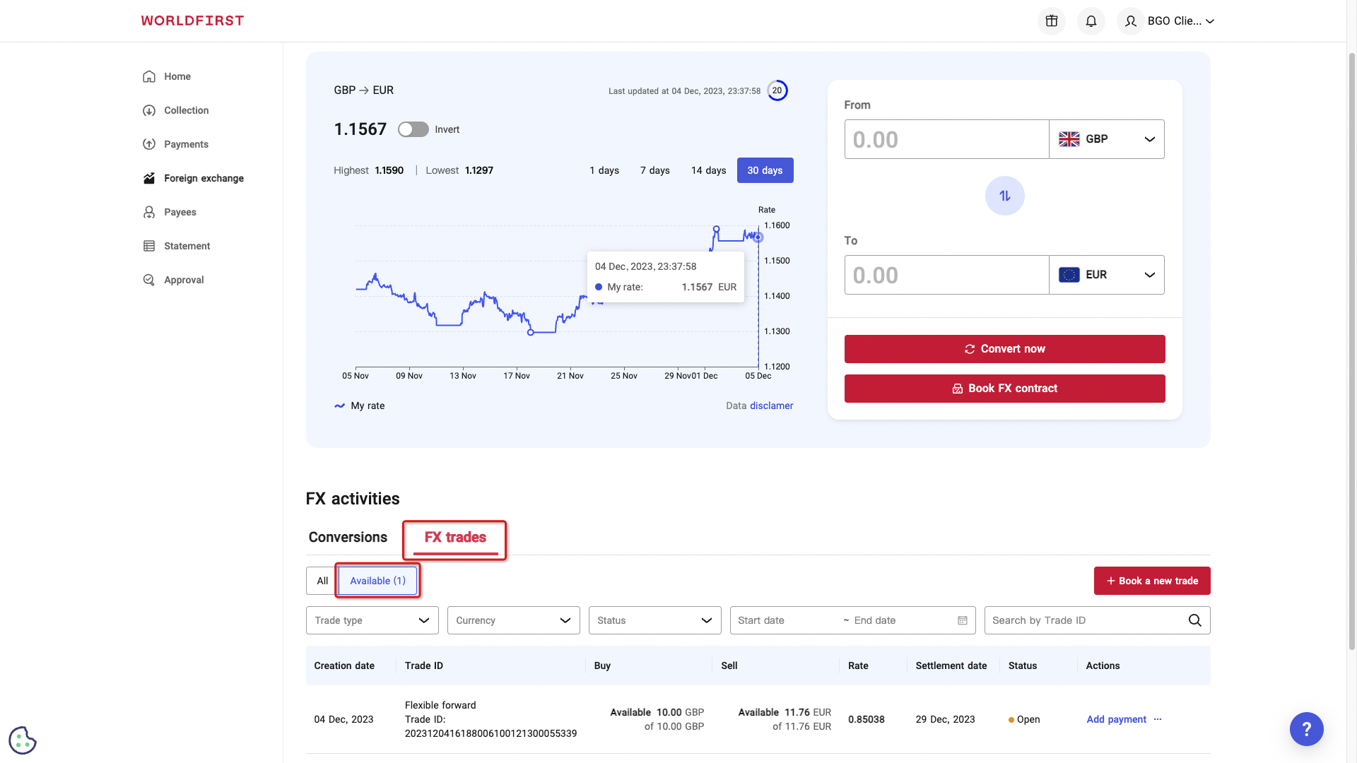 Click on the ‘FX trades’ tab under ‘FX activities’ and click on ‘Available’.