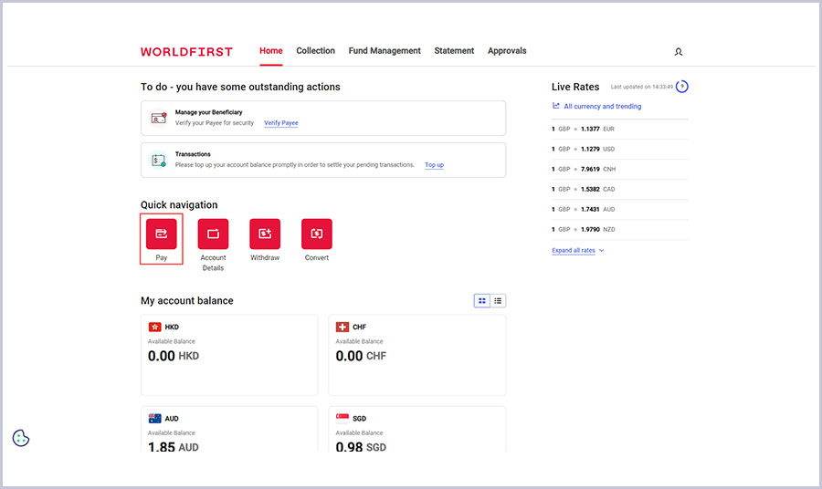 Once you have logged in to your WorldFirst account, go to the dashboard and click on ‘Pay’ via the ‘Quick Navigation’.