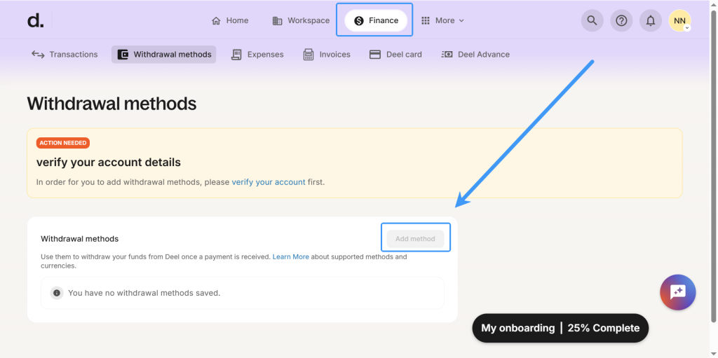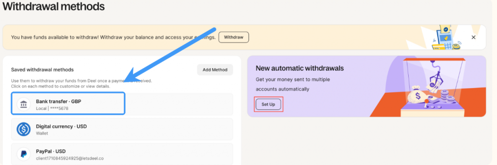 Loại Tài khoản nhận tiền cần thiết lập để rút tiền từ Deel.com