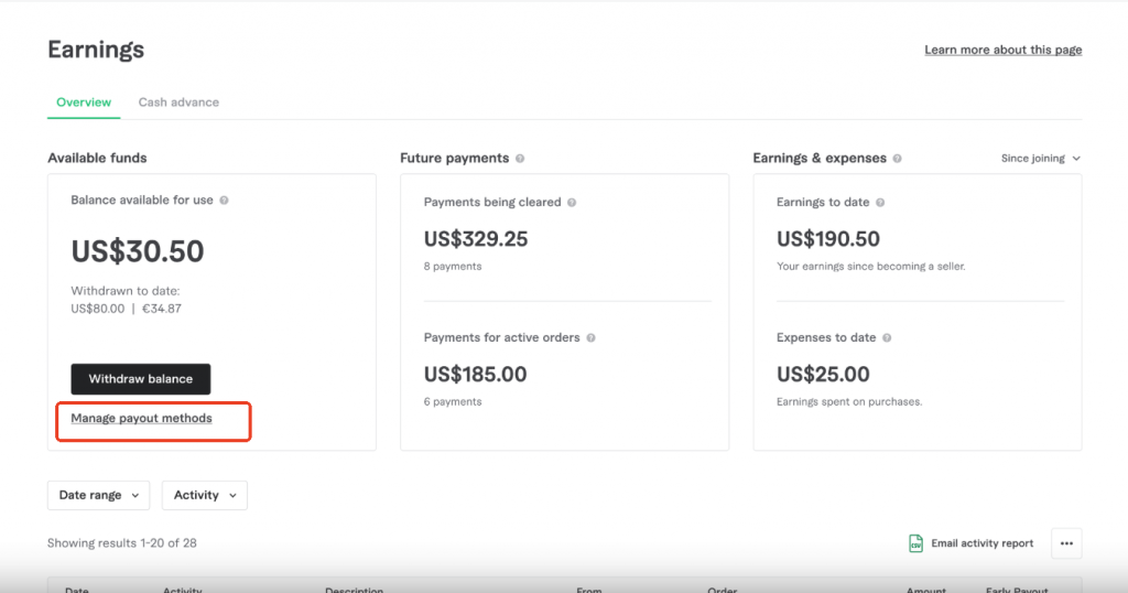 - Nhấp vào “Rút số dư (Withdraw balance)” hoặc “Quản lý phương thức thanh toán (Manage payout methods)” và chọn “Chuyển khoản ngân hàng (Bank transfer)”