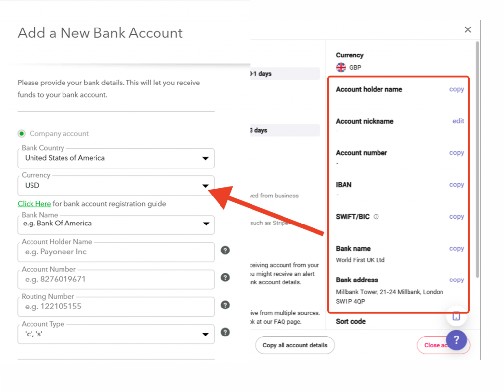 - Thêm chi tiết tài khoản nhận tiền của bạn từ WorldFirst