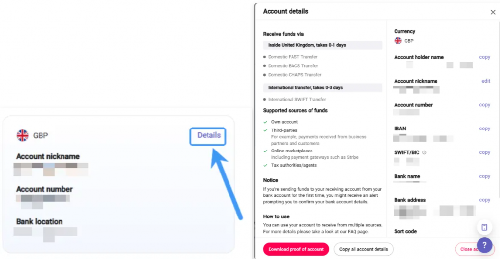 - Nhấp vào “Thêm IBAN (Add an IBAN)” để thêm hoặc cập nhật thông tin tài khoản nhận tiền của bạn từ WorldFirst trong các trường được chỉ định