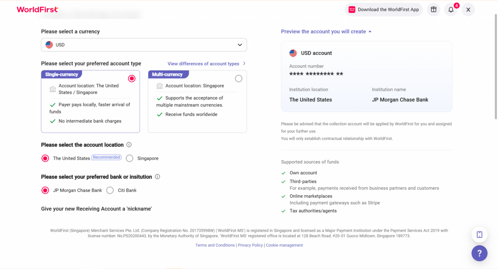 Sau đó, nhấp vào “Quản lý tài khoản (Manage Accounts)” > “Thêm tài khoản nhận tiền mới (Add a New Receiving Account)”. Sau đó, bạn có thể chọn loại tiền tệ cho Tài khoản nhận tiền