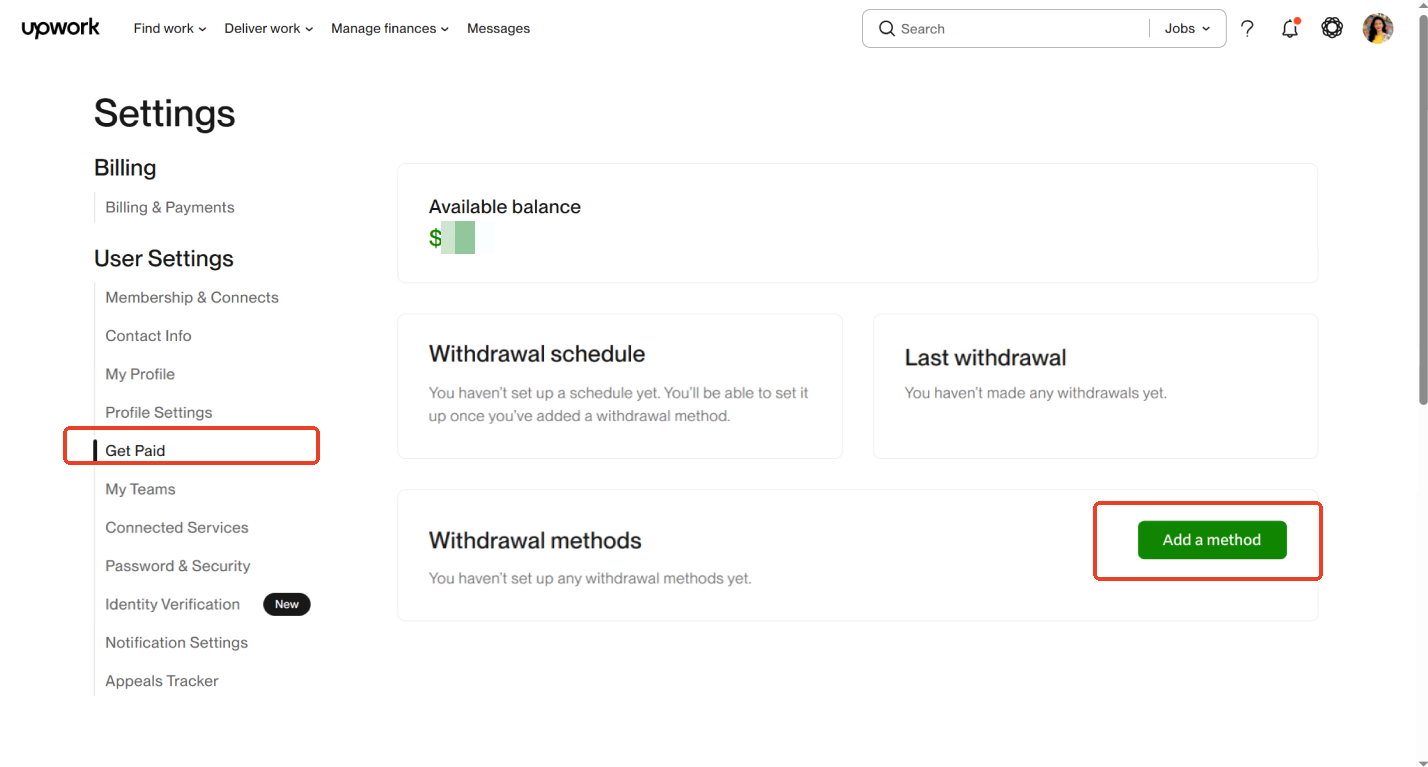 Bạn cần thiết lập Tài khoản nhận tiền theo loại tiền tệ tương ứng với số dư Upwork của bạn. Nếu không, Upwork có thể quy đổi số dư sang loại tiền tệ của tài khoản và bạn sẽ bị tính phí quy đổi cho giao dịch này.