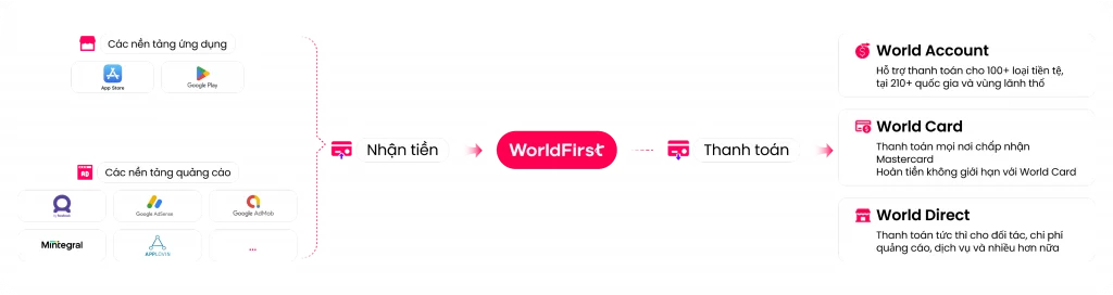 Giải pháp toàn diện: Tài khoản đa tiền tệ World Account, nền tảng đối tác toàn cầu World Direct và thẻ thanh toán World Card. Tối ưu hiệu quả dòng tiền, giúp bạn tập trung vào phát triển sản phẩm.